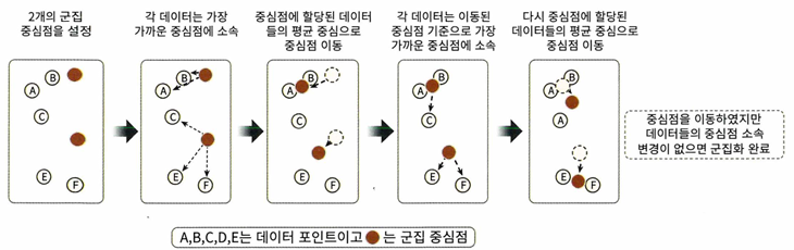 k개의 초기 중심점 선택 > 데이터 포인트 할당 > 중심점 업데이트 > 소속 변경 없거나 반복 횟수 완료 시 종료